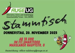 Es ist wieder soweit! Unser nächster Stammtisch findet am Donnertag, 20.November 2025 statt. Diesmal treffen wir uns in Maxglan, im FIT.smartfood. Wir freuen uns, wenn du kommst. Anmeldung bitte unter office-salzburg@auge.or.at.